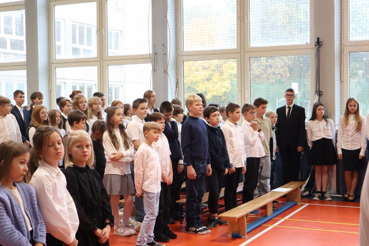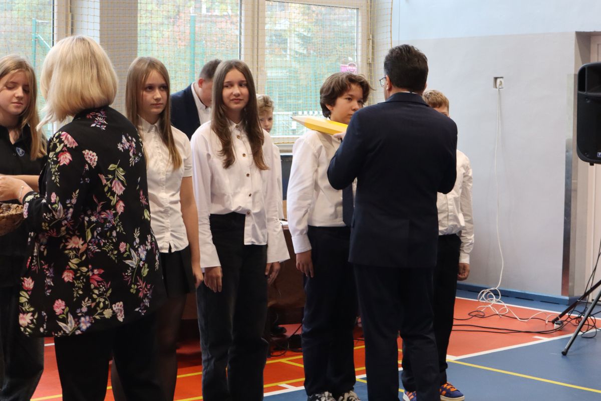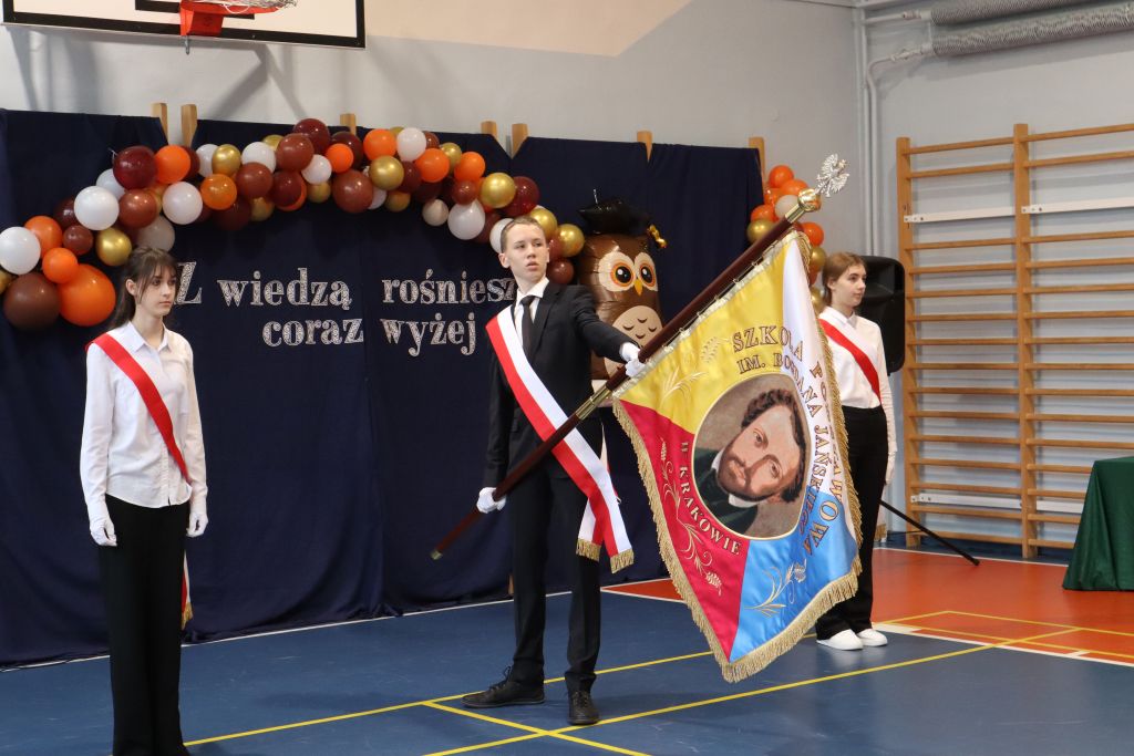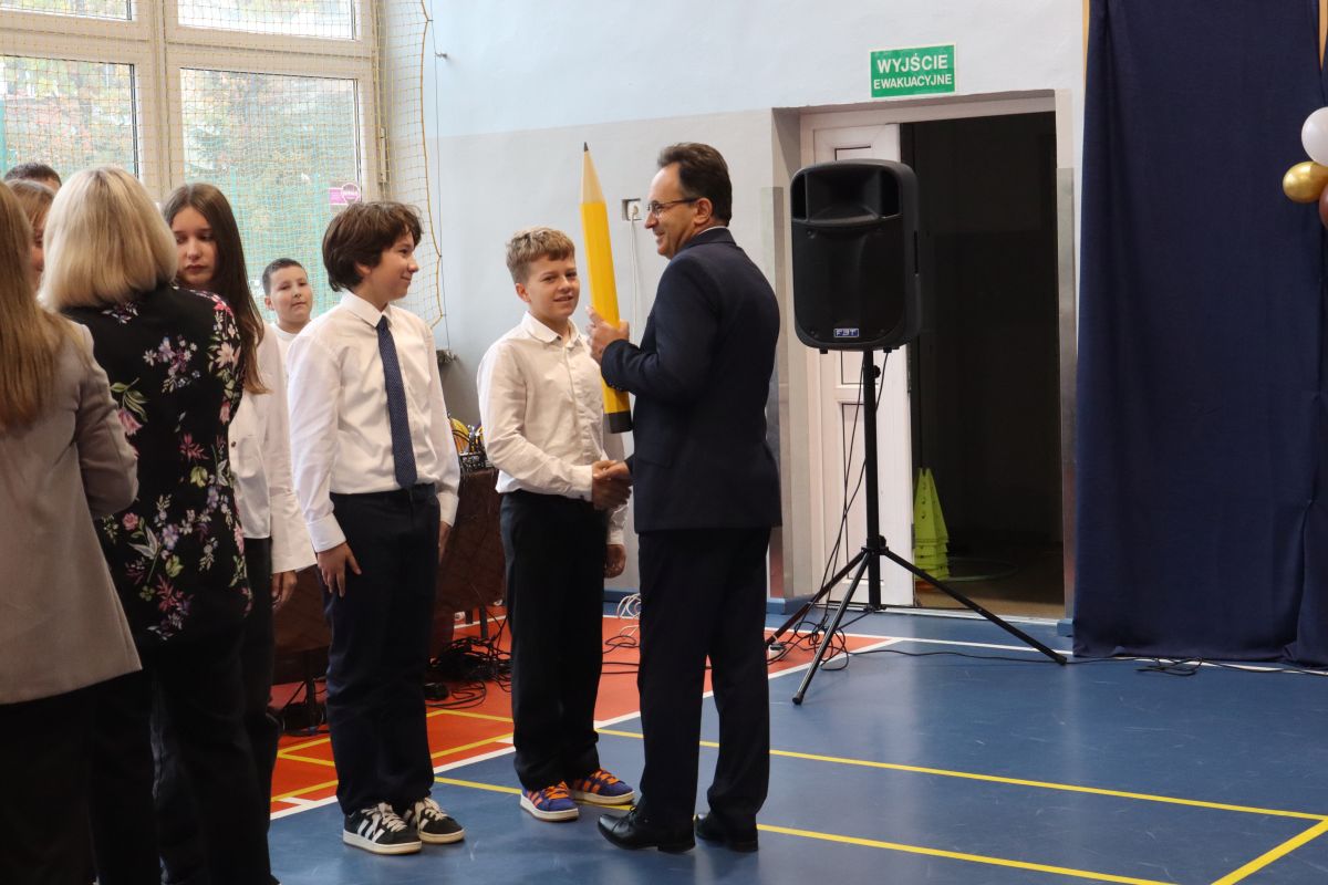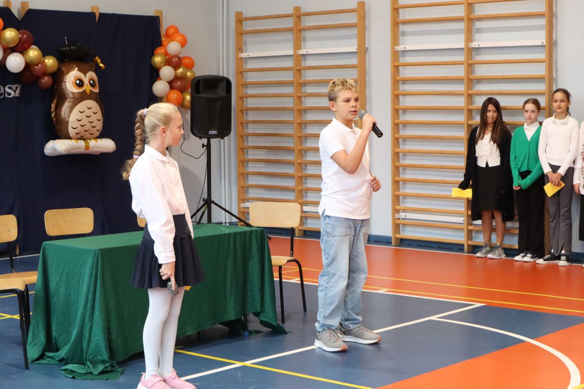 Tradycyjnie w Dzień Edukacji Narodowej odbyła się w naszej szkole wyjątkowa uroczystość – Pasowanie na Ucznia. Oprócz pierwszoklasistów, którzy uświetnili ten dzień występem artystycznym, ślubowanie złożyli również nowi uczniowie ze starszych klas. Wszyscy zostali oficjalnie przyjęci do społeczności Szkoły Podstawowej im. Bogdana Jańskiego. Uczniowie klas 5 zaprezentowali przedstawienie poświęcone codziennej pracy nauczycieli. W humorystyczny sposób pokazali z jakimi wyzwaniami pedagodzy mierzą się każdego dnia – od przygotowywania uczniów do egzaminów, przez trudną drogę awansu zawodowego, aż po nieustanne poszukiwanie sposobów, by nauka stała się ciekawa i inspirująca. Całość uświetnił występ chóru, który zaśpiewał motywujące piosenki dodające sił i otuchy do dalszej pracy.