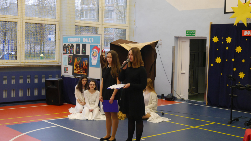 22 grudnia był w naszej szkole dniem wyjątkowym. Spotkaliśmy się po raz ostatni w tym roku kalendarzowym, by na uroczystym apelu wspólnie świętować nadchodzące Boże Narodzenie. Rozpoczęliśmy od „niekoniecznie” tradycyjnych „Jasełek na wesoło”, przygotowanych przez uczniów klas 2a i 3c pod opieką pani Renaty Kępy i pani Magdaleny Karyś. W przedstawieniu brała też udział klasa 1 szkoły podstawowej wraz ze swoją wychowawczynią, panią Wioletą Cichoń. Pierwszoklasiści zaśpiewali dwie kolędy: „Aniołowie biali” oraz „Oto o północy” (zespołu TGD) i zatańczyli do utworu TGD pt. „Noel”.