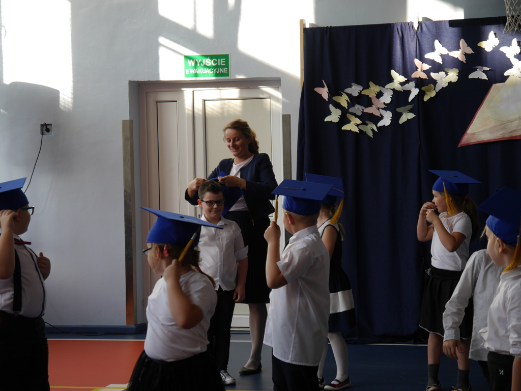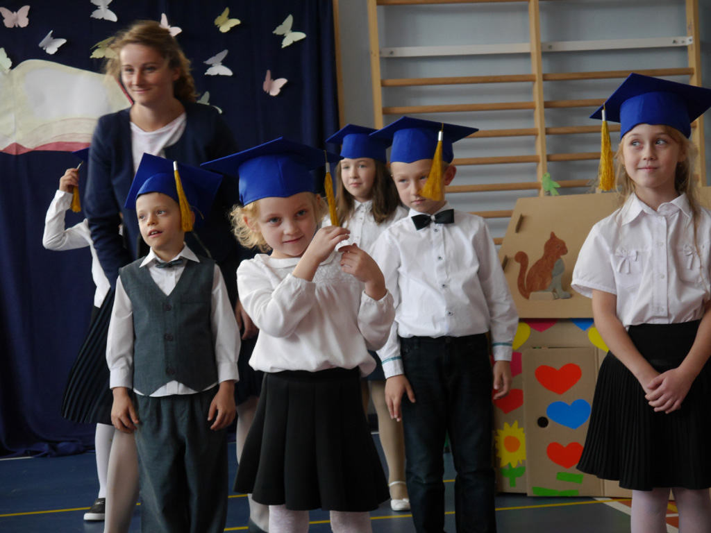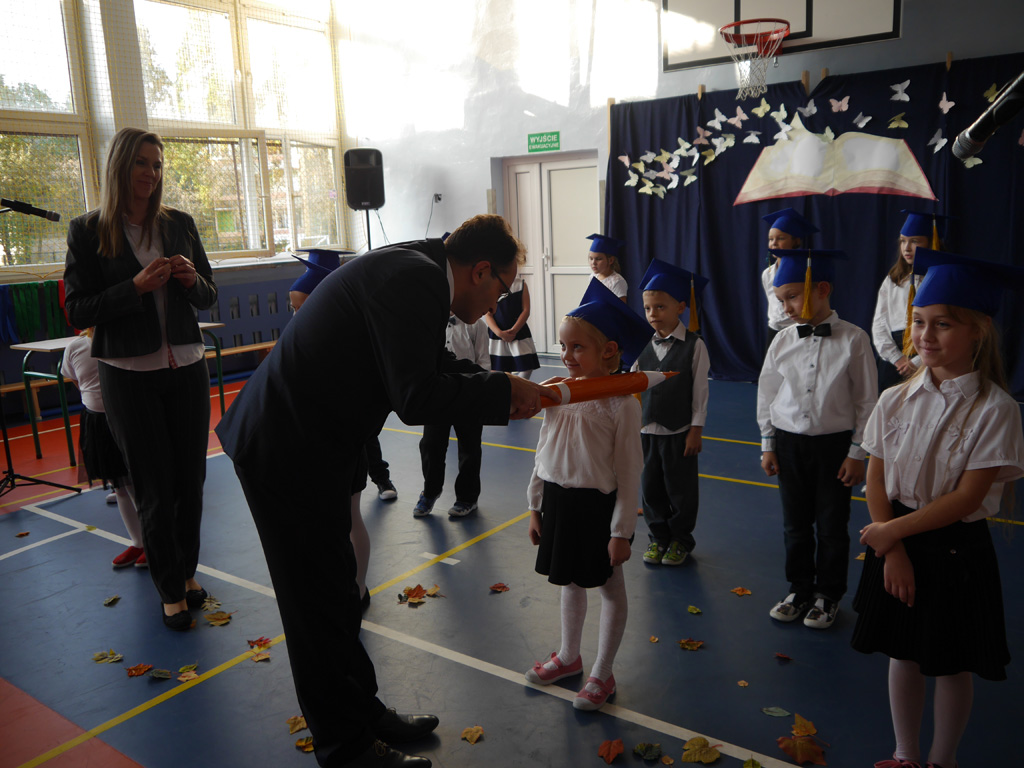 Tego samego dnia do grona Szkoły Jańskiego zostali uroczyście przyjęci nasi najmłodsi uczniowie. Było to ich pierwsze wystąpienie na szkolnej scenie. Po zaprezentowaniu swoich umiejętności wokalno-tanecznych i recytatorskich Pan dyrektor przyjął ślubowanie uczniów, a następnie wraz z Panią wicedyrektor dokonali uroczystego aktu pasowania i przyjęcia do społeczności szkolnej. Pierwszoklasiści zaskoczyli wszystkich swoją samodzielnością i odwagą. Gotowość dzieci, by otrzymać miano ucznia była widoczna również w otwartym i śmiałym dialogu z Dyrektorem, który próbował dowiedzieć się, czy na pewno znają obowiązki ucznia. Radość dzieci wyraża ich zaangażowanie i starania włożone w przygotowanie się do tej uroczystości. Po występie na najmłdoszych uczniów i zaproszonych przez nich gości czekała w ich klasie słodka niespodzianka.