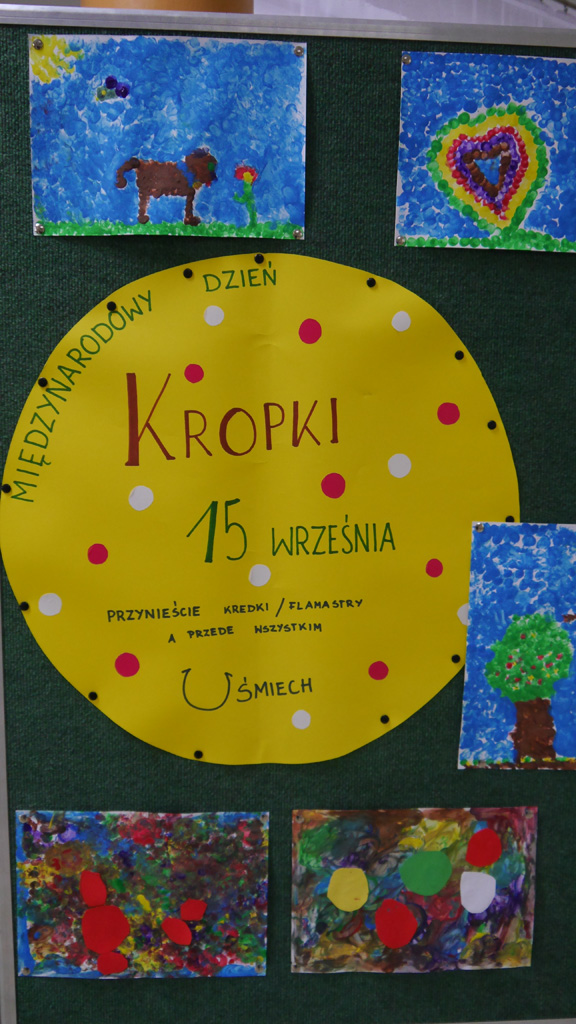 Pierwszy Dzień Kropki w naszej szkole już za nami. Przekształcaliśmy kropki w nowe światy, wymyślaliśmy historyjki i rozegraliśmy turniej twistera. Zachwyciły nas prace pierwszoklasistów - można je już podziwiać w holu szkoły. Wymieniliśmy je za pamiątkowe dyplomy. Cieszyli się też uczniowie klasy 2 a i b, którzy za swoją kreatywność i odwagę zostali nagrodzeni "niepytajkami". Teraz przez cały rok będziemy zbierali pomysły, aby przyszłoroczne obchody dały wszystkim jeszcze więcej radości.