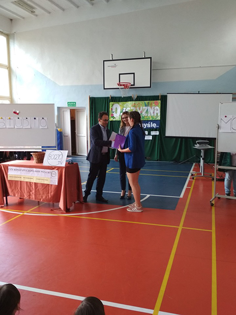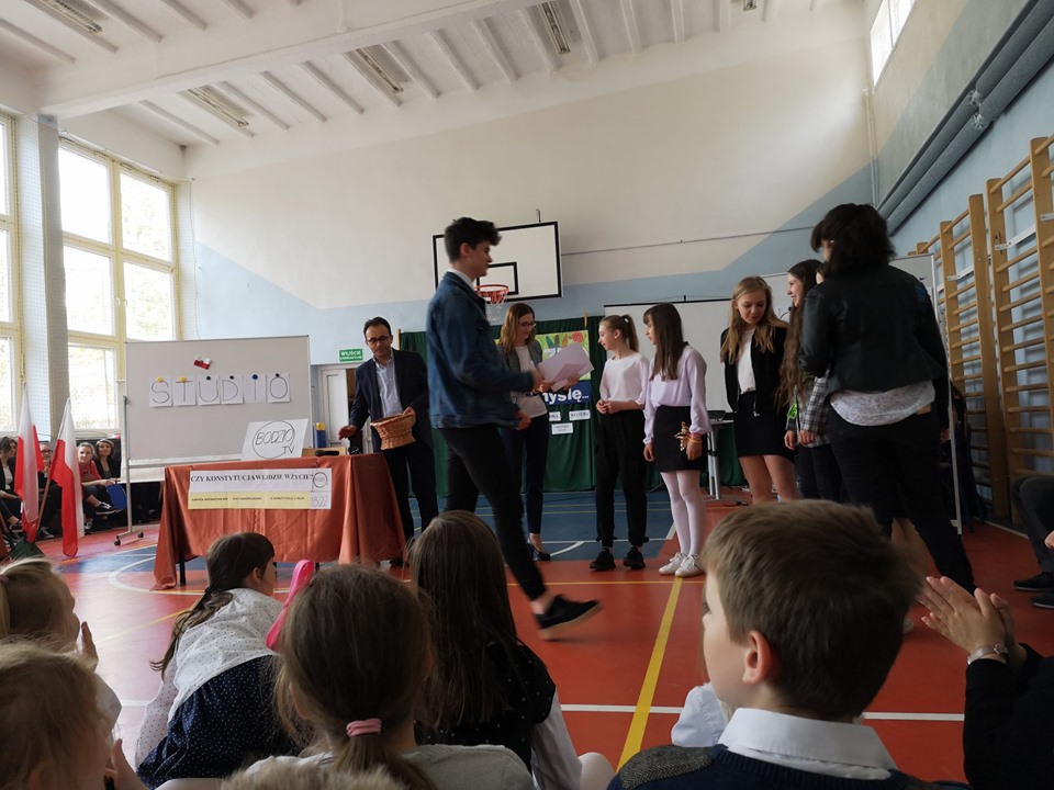 Występ uczniów poprzedziło uroczyste odśpiewanie hymnu państwowego. Następnie w formie wiadomości telewizyjnych zaprezentowane zostały najważniejsze wydarzenia związane z Konstytucją 3 Maja. Na koniec apelu pan dyrektor wraz z panią Agatą Łysień wręczyli nagrody laureatom oraz uczestnikom szkolnego konkursu w zapamiętywaniu liczby pi - serdecznie gratulujemy.