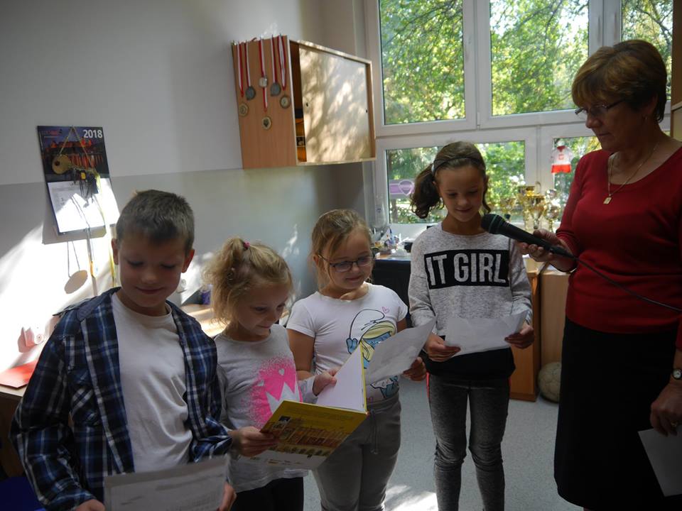 29 września został ustanowiony przez Polską Izbę książki dniem głośnego czytania. To święto, którego najważniejszymi beneficjentami są dzieci. Czytanie im na głos stymuluje ich rozwój, wzbogaca słownictwo i pobudza wyobraźnię. Ponieważ 29 września był w sobotę w naszej szkole obchodziliśmy je dziś. Uczniowie klasy drugiej Julia, Ida, Zuzia i Albert czytali wszystkim uczniom wiersze z książki Michała Rusinka „Krakowski rynek dla chłopców i dziewczynek”. Mieliśmy okazję usłyszeć, jak czytają drugoklasiści i, poznać pana Michała Rusinka jako autora zabawnych wierszy dla dzieci i popatrzeć na Kraków jego oczami.